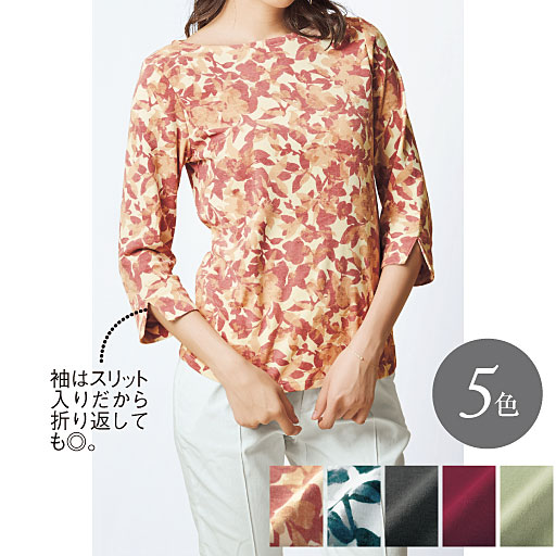 【ご注文が初めての方or5,000円(税別)以上のご注文で送料無料】すっきり着映えが1枚で!微起毛綿100%でやさしくあったかなボートネック7分袖。寒い日のインに!暖かい日はスムースTシャツとして1枚でも着られます。首周りスッキリおしゃれなボートネックは1枚あると便利。袖はスリット入りだから折り返しても◎チャコールグレー、ダークレッド、アースグリーンの無地3色に、オレンジ系とブルー系のボタニカル柄を2色、揃えています。 ■カラー:プリントB(ブルー系) ■サイズ:L,LL,M,3L