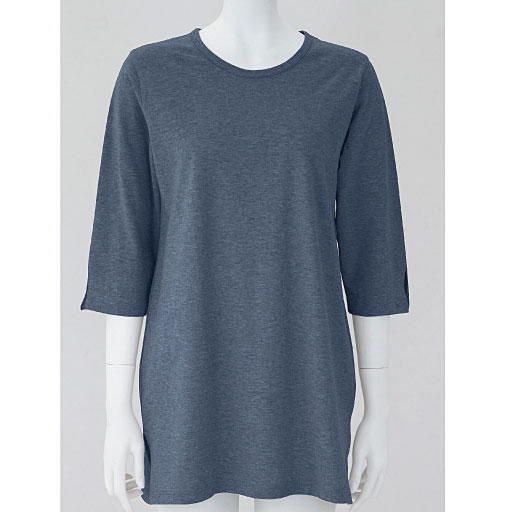 【ご注文が初めての方or5,000円(税別)以上のご注文で送料無料】発売以来ロングヒット中の綿100%SZ天竺素材のTシャツシリーズ。洗濯しても型くずれしにくく、着心地のよさをキープできるのが人気の秘密。気軽にどんどん着てもよれないから、いつも見栄えよくデイリーに着こなせます。お尻やおなかをカバーできるロング丈の7分袖Tシャツは、両袖と両裾にスリット入りで動きやすいのもポイント。ニュアンスのある杢カラーがおしゃれな、豊富な5色展開。 ■カラー:ネイビー(杢) ■サイズ:M,L,3L,5L,LL