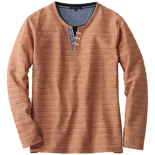 注目のグッズがお手ごろに購入できる情報です。     【ご注文が初めての方or5,000円(税別)以上のご注文で送料無料】ヘンリーネックカットソーの下にTシャツをインしているように見える、重ね着風の長袖Tシャツ。立体的なタック&スラブ入りボーダー柄カットソーに、飾りボタンやボタンループで遊び心をプラスしました。サッと一枚で着映えする大人のおしゃれ時短アイテム。そして、「このこだわりデザインで、このプライス」なのが、なによりも魅力です! ■カラー:マスタード系 ■サイズ:5L,M,L