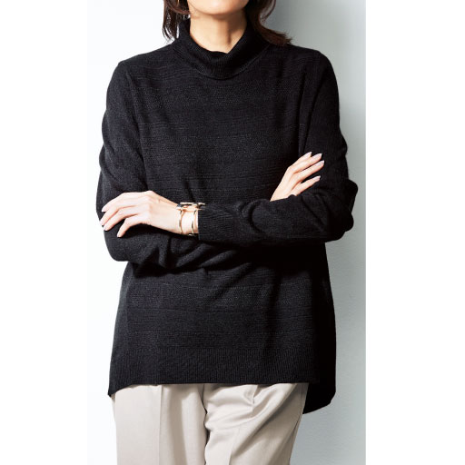 【ご注文が初めての方or5,000円(税別)以上のご注文で送料無料】繊維の間に空気をたっぷり含んでいるから、ふわっと軽くてあたたか。しっかり肉厚で、包み込まれるような着心地が楽しめます。ご家庭で気軽に洗えるので、毎日の着まわしに大活躍!フロントに柄編みを施した、後身が長めのタートルネックニットです。 ■カラー:ブラック ■サイズ:M,LL,S,3L,L