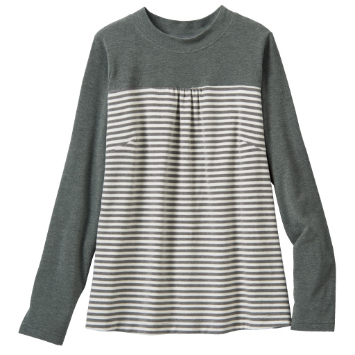 注目のグッズがお手ごろに購入できる情報です。     【送料無料】前身頃の胸元で切り替えとギャザーを入れたデザイン性の高いトップス。ややAラインで体型もカバー。衿元は着心地とデザイン性を兼ね備えたプチハイネック。スエードのようになめらかで、しっとりとした風合いとふんわりやわらかな肌ざわりが魅力的。おうちで洗濯OKなので、簡単にケアできるのも嬉しい。-plump-(プランプ)-ふっくらサイズのおしゃれ服専門ブランド、『plump(プランプ)』。すっきりきれいに見えるデザインと、着心地のよさが自慢のアイテム満載!身につけたときの「あ、これいい!」をぜひ体験してください♪ ■カラー:ボーダーA(グレーxボーダー) ■サイズ:LL,L,6L,3L,4L,5L
