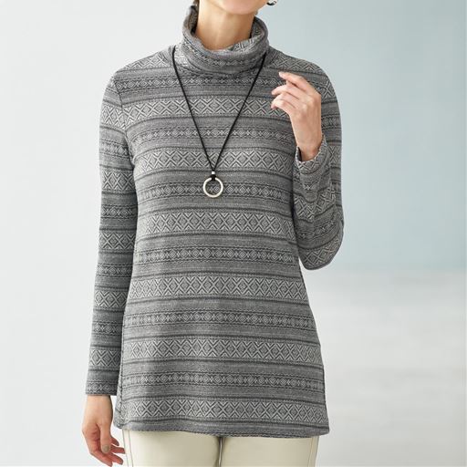 注目のグッズがお手ごろに購入できる情報です。     【ご注文が初めての方or5,000円(税別)以上のご注文で送料無料】2枚の生地を貼り合わせて空気の層をつくった接結素材。表はウール混で暖かく、裏は綿素材で快適な肌ざわり。ひねりのあるオフタートルがやさしい印象。チュニック丈で気になるヒップまでカバー。 ■カラー:グレー(ジャカード柄) ■サイズ:3L,M,L,S,LL,4L