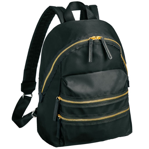 注目のグッズがお手ごろに購入できる情報です。     【ご注文が初めての方or5,000円(税別)以上のご注文で送料無料】クールな黒のリュックを小ぶりサイズで女らしく。2つの前ポケット+背中ポケット、大きく開くファスナーで使い勝手が優秀。ゴールドのファスナーが上品! ■カラー:ブラック