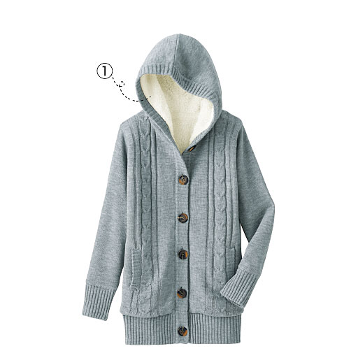 注目のグッズがお手ごろに購入できる情報です。     【ご注文が初めての方or5,000円(税別)以上のご注文で送料無料】旬のケーブル柄を編み込んだニットは、着心地も見た目もぬくぬく。身頃とフード裏はボアでさらにあったか。さらっと羽織るだけで、ナチュラルに着こなせる1着だよ。 ■カラー:グレー ■サイズ:L,LL,M,S