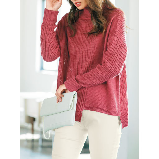 注目のグッズがお手ごろに購入できる情報です。     【ご注文が初めての方or5,000円(税別)以上のご注文で送料無料】折り返しデザインの袖口で、さりげなくこなれ感をアップ。編地切り替えで立体感があり、シンプルに1枚でオシャレに着こなせるニットです。縦のラーベン編みと横のガーター編み切り替えのアクリル100ニットは乾きやすく取り扱いも簡単♪裾のイレギュラーヘムデザインも今ドキです。 ■カラー:コーラル ■サイズ:L,3L,M,LL